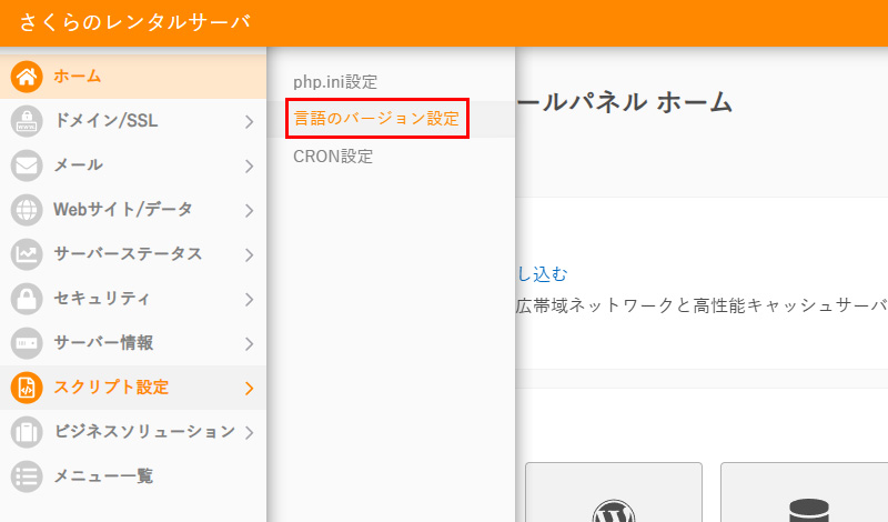 コンパネを開いたら、左メニュー「スクリプト設定」の中の「言語のバージョン設定」を選択。