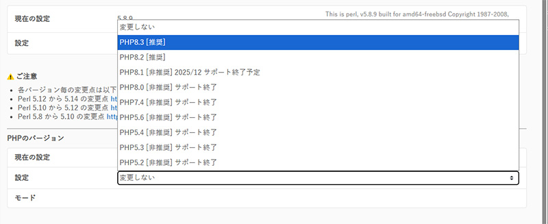言語のバージョン設定の画面が開いたら、少し下にスクロールするとPerlのバージョン項目の次にPHPのバージョン項目があります。
