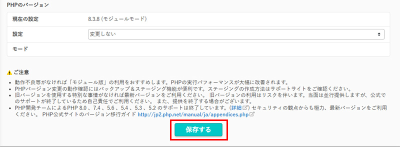 PHPのバージョン内の「設定」部分で推奨のバージョンを選択します。