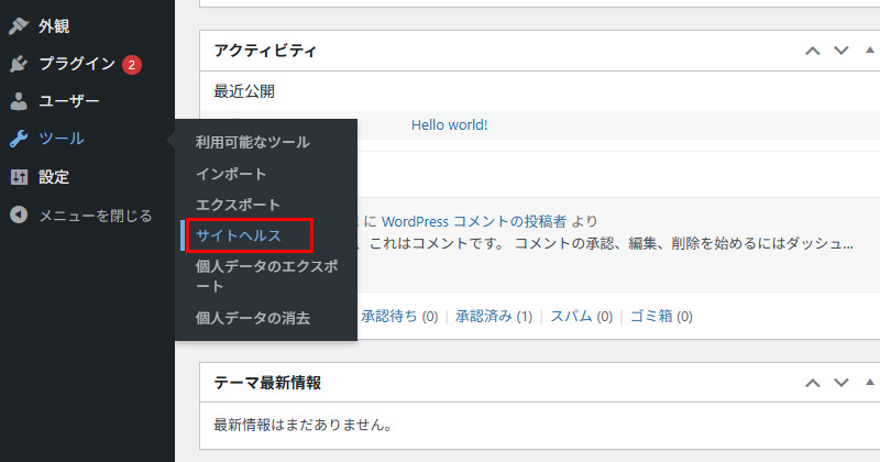 管理画面左メニュー「ツール」内の「サイトヘルス」を選択します。
