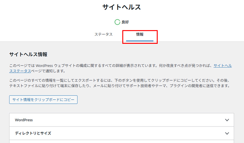 サイトヘルス画面が開いたら、「情報」タブを選択します。